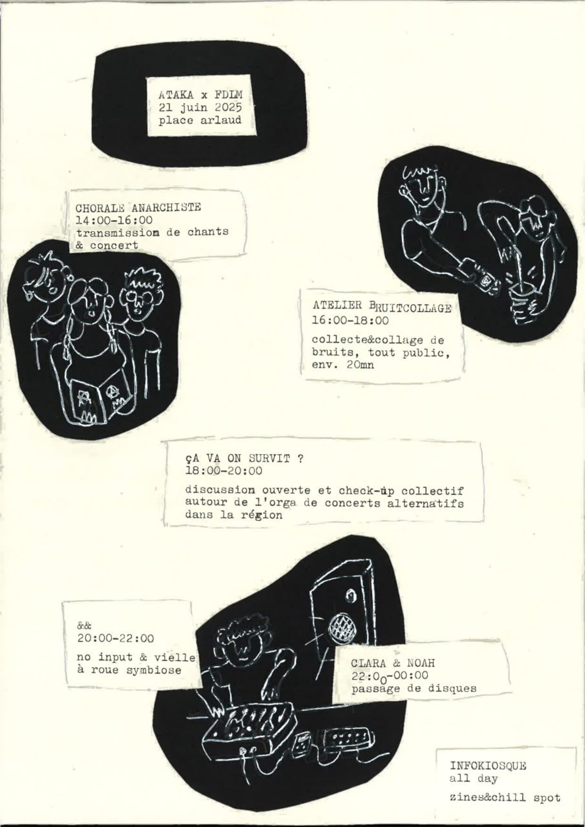 Ce 21 juin, la scène d’ataka propose de faire et de réfléchir à des trucs autant qu’en regarder. Pour ça, elle accueille pendant l’après-midi diverses activités et collectifs : une intervention de la Chorale anarchiste, qui organise une passation de chants suivie d’un concert, un atelier tout public et ludique autour de l’enregistrement et l’amplification de bruits, et une discussion ouverte autour des enjeux d’organisation des scènes alternatives de la région.